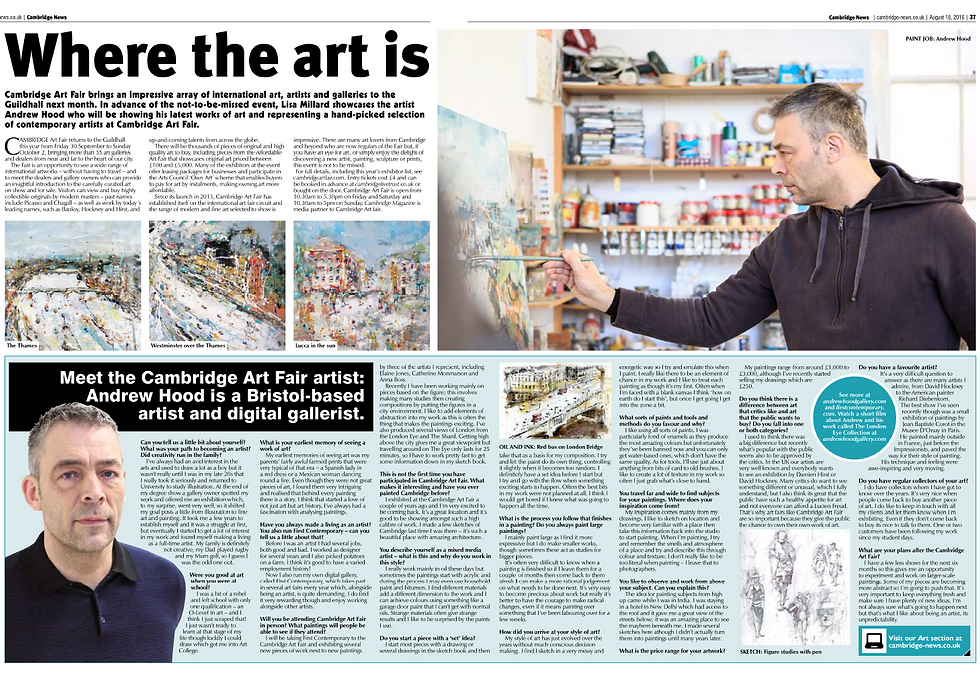 Cambridge NewsAndrew HoodAug 12, 20161 min readUpdated: Oct 20, 2020 Ahead of the Cambridge Art Fair at the Guildhall (30th September – 2nd October), Andrew Hood talks to Lisa Millard at Cambridge News about his influences, painting process and plans for the future. Click on the image to read the interview in full.